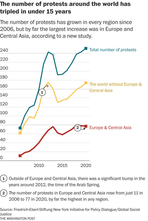 Adam Taylor from the Washington Post (4 November 2021) offers a thoughtful review of a new study (“World Protests: A Study of Key Protest Issues in the 21st Century,” from a team of researchers with German think tank Friedrich-Ebert-Stiftung (FES) and the Initiative for Policy Dialogue, Columbia University ) which demonstrates that the scale and scope of global protests have tripled since 2006 – see Figure and map below. More than half the protests worldwide were due to perceived failures of democratic governance and demands for enhanced political representation. Others pertain to corruption, inequality, lack of decent jobs and working conditions, poor living standards, and lack of action on climate change. So far, politicians across the world have not responded satisfactorily to these concerns. This implies that such protests are likely to continue to the detriment of social cohesion.