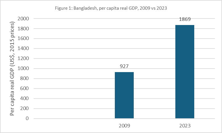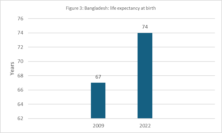 In retrospect, the Hasina regime represents a cruel paradox. Political repression was juxtaposed with substantial economic and social gains. Growth was sustained and rapid leading to a doubling of real per capita income between 2009 and 2023 – see Figure 1. Poverty fell significantly, and life expectancy increased substantially – see Figures 2 and 3. A UN assessment noted that ‘the country is internationally recognized for its good progress on several gender indicators’. The garments industry and remittances consolidated their position as leading export earners. New industries emerged, most notably pharmaceuticals and shipbuilding. Large-scale infrastructure projects were completed that enhanced communications and connectivity.