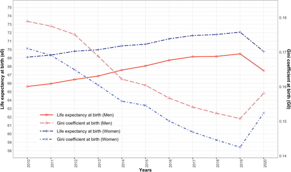 Inequality in life expectancy – which was falling consistently between 2010 and 2019 rose sharply after that. In sum: